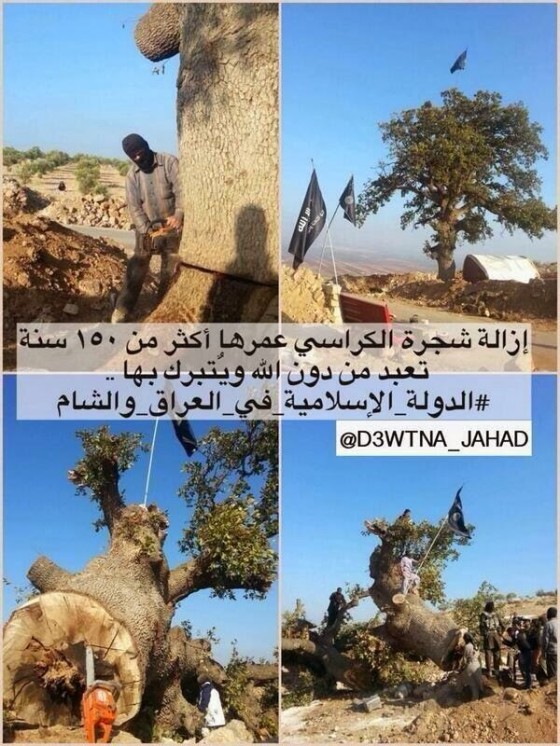 'ووفق (بي بي سي) قال مصدر جهادي في تغريدة عبر تويتر 'الحمد لله، تمت ازالة الشجرة التي يزيد عمرها عن 150 سنة والتي كان الناس يعبدونها